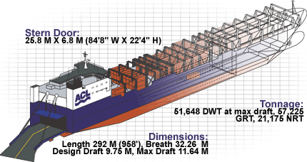 Bei der Atlantic Concert handelt es sich um ein sog. RoRo-Frachtschiff mit etwas über 290m Länge und einer Breite von etwas über 30m. RoRo steht für Roll On-Roll Off, was soviel bedeutet, dass die Ladung durch Fahrzeuge aufs Schiff gefahren wird (und nicht mittels Kran aufs Schiff gebracht wird). Die Atlantic Concert kann bis zu 1000 Fahrzeuge laden und benötigt für die Atlantiküberquerung rund 6.5 bis 8 Tage.
