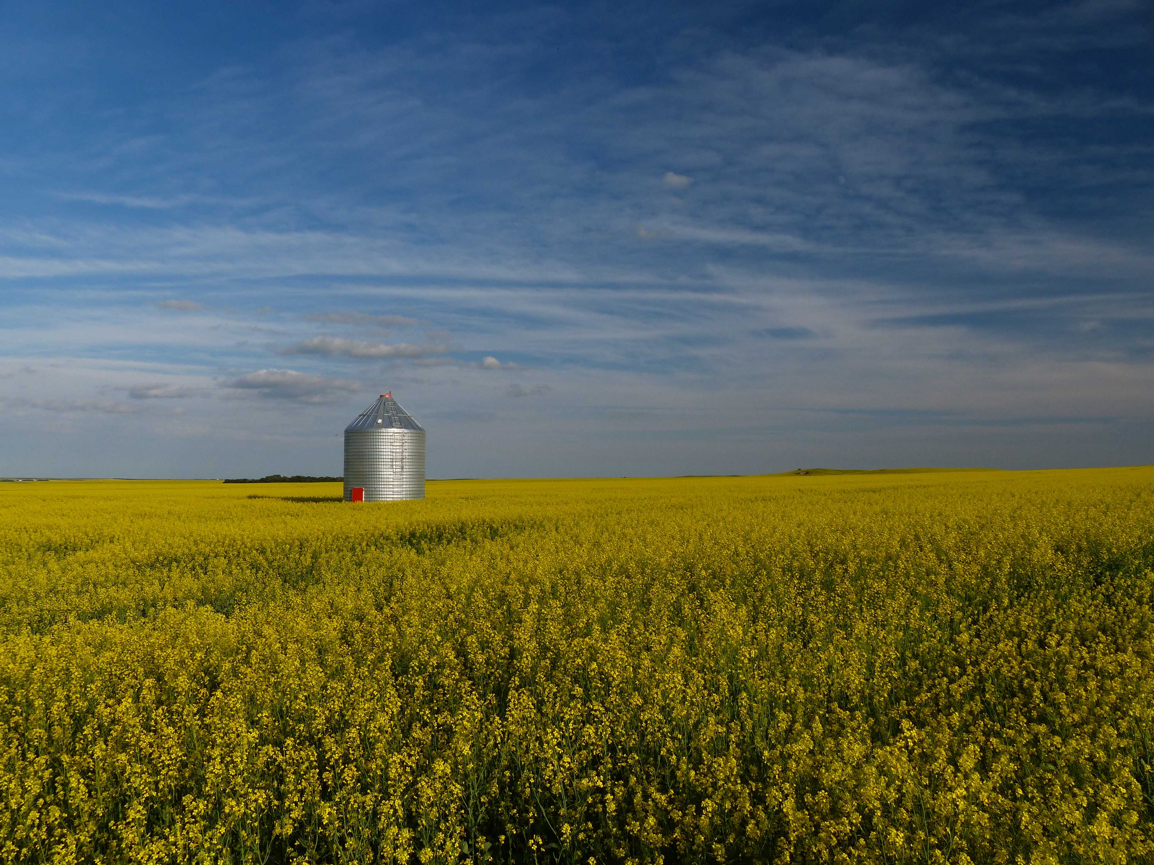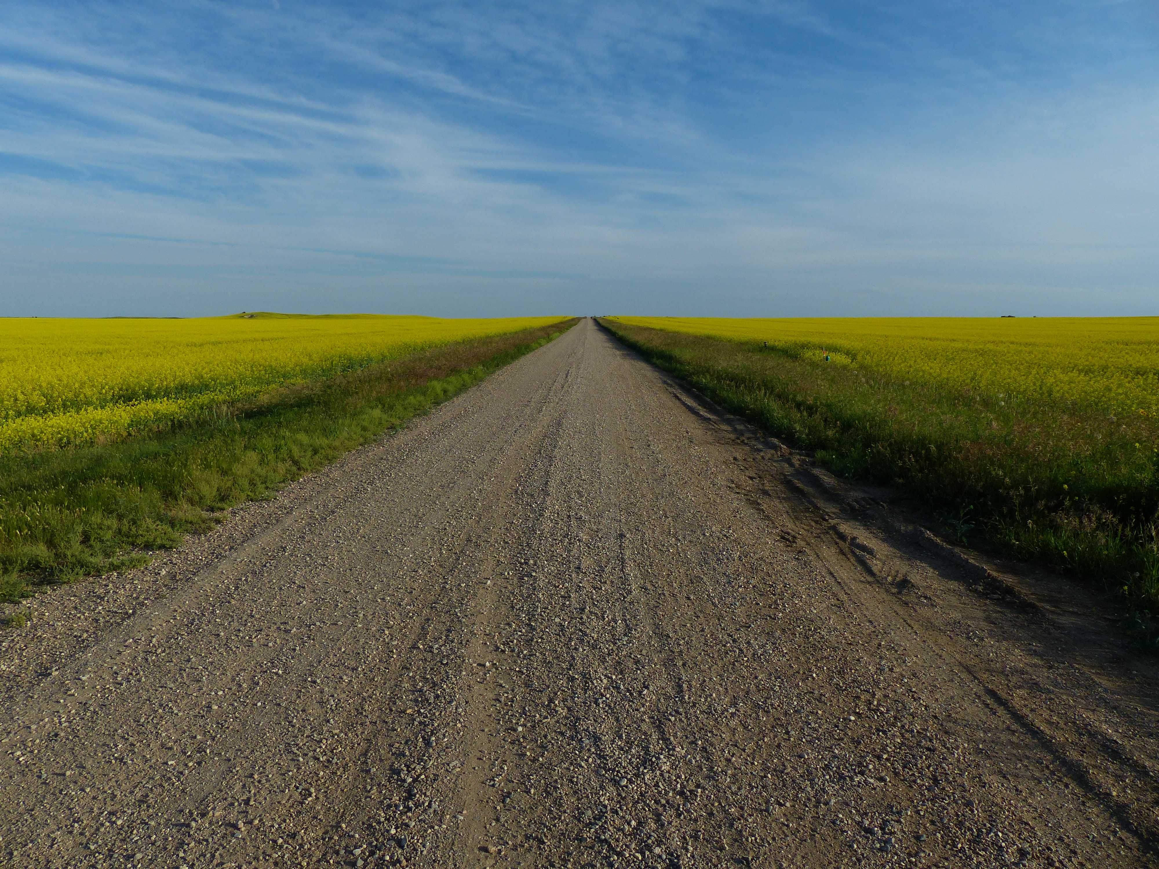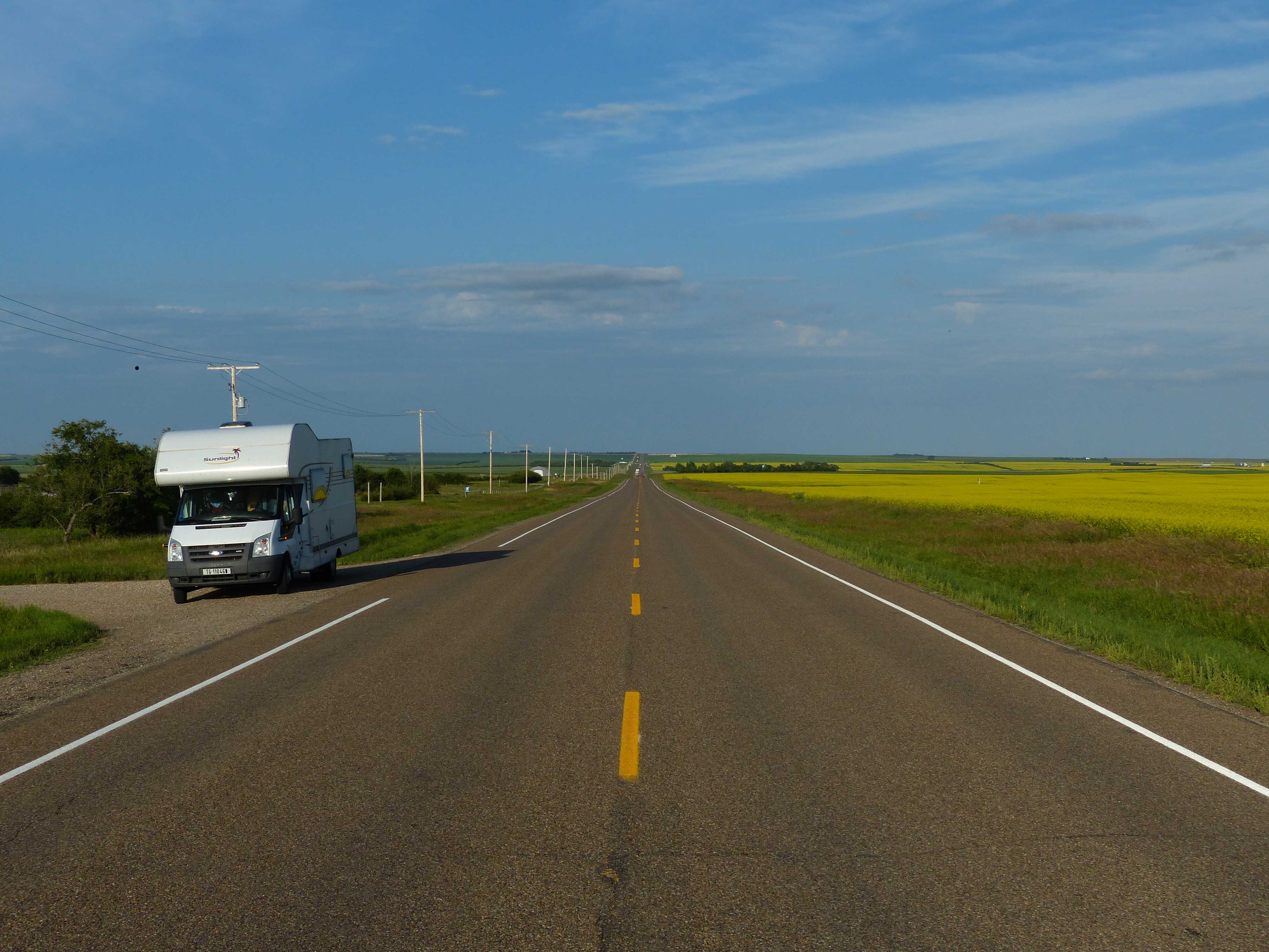 Während der Fahrt durch die beiden Provinzen Manitoba und Saskatchewan wurde unser Gefühl für Weite neu definiert: gerade Strassen bis zum Horizont, schnurgerade aneinandergereihte Telefonmasten, die sich in der endlosen Weite verlieren, und immer wieder Getreidefelder und vor allem schöne, gelb blühende Rapsfelder. Die unzähligen Landmaschinenverkäufer, welche es fast in jeder grösseren Siedlung gibt, erinnern daran, dass wir in der Kornkammer Kanadas unterwegs sind. Bei der ausgestellten Menge an Geräten wird man den Eindruck nicht los, dass hier Mähdrescher gleich im Doppel- oder Triopack gekauft werden.